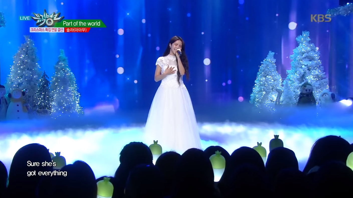 21日に韓国で放送されたKBS「ミュージックバンク クリスマススペシャル」には、MAMAMOOのリーダーでメインボーカルのソラが出演。3曲のディズニー映画の名曲を単独で歌い上げました。
